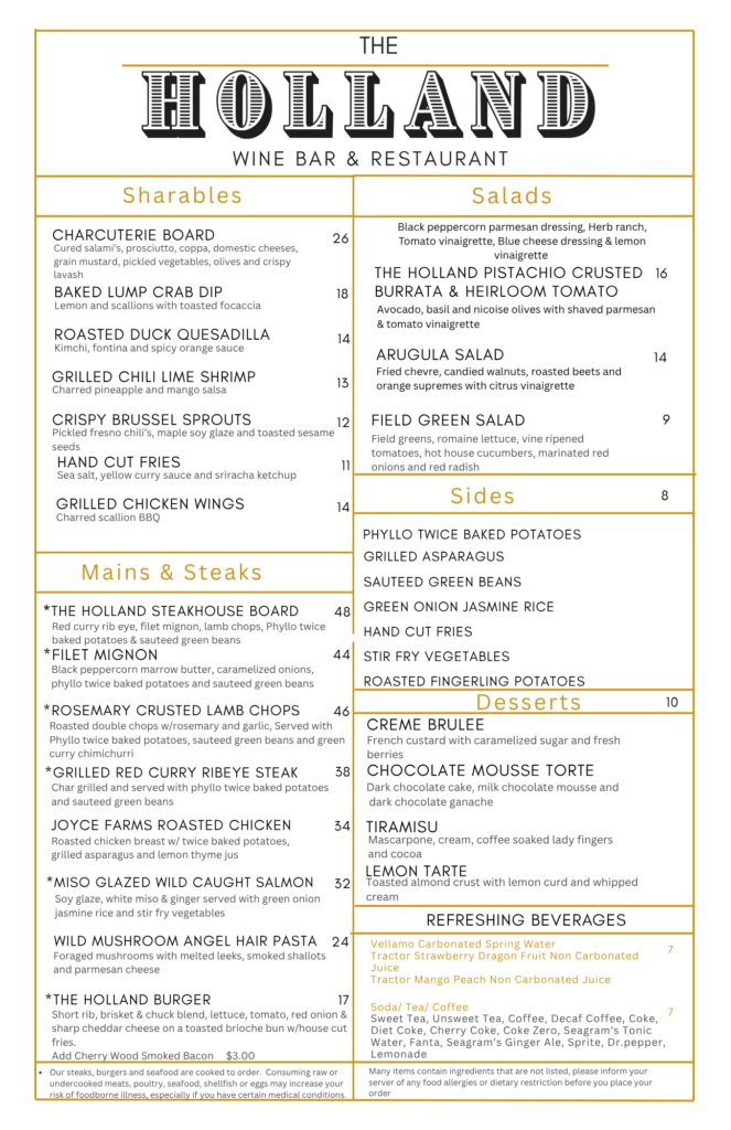 The Holland is a wine bar and restaurant offering a curated selection of wines and a menu of elevated, yet approachable dishes. Whether you’re enjoying a casual evening with friends, a romantic date night, or hosting a corporate event, our comfortable and upscale space is perfect for every occasion.