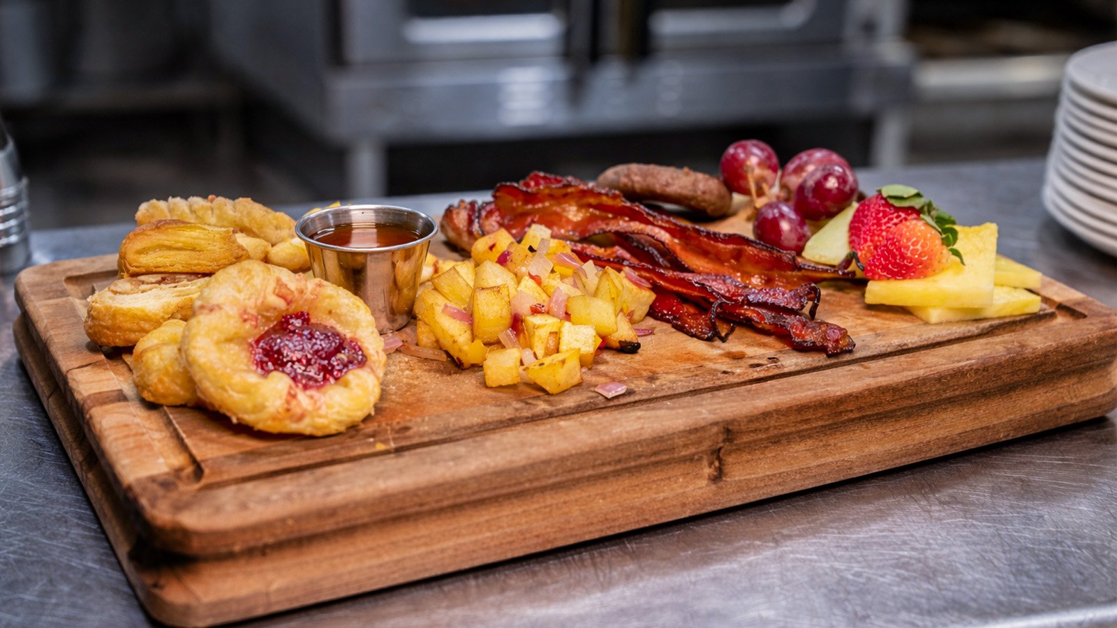Smoked bacon, deviled eggs, assorted pastries and fresh-cut fruit.